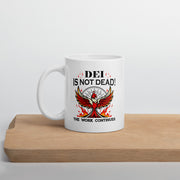 Start your day with a message that matters. This mug features the powerful "DEI IS NOT DEAD" design with a phoenix rising from the ashes—a reminder that no matter the pushback, the work continues.